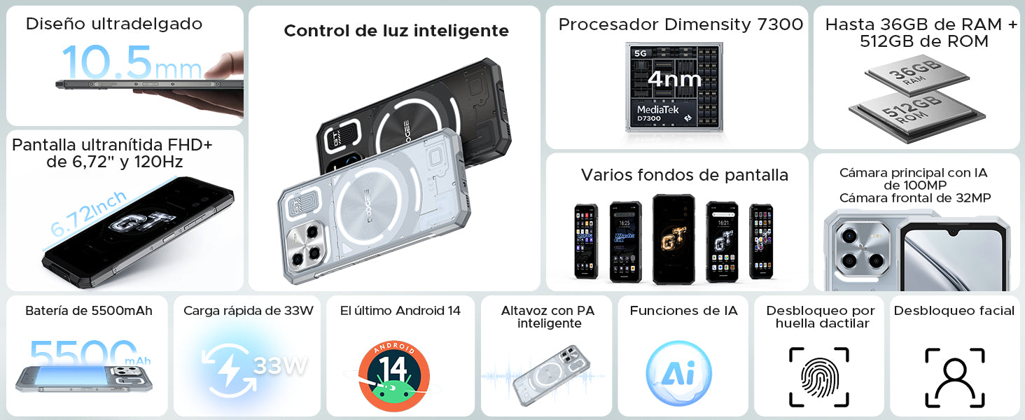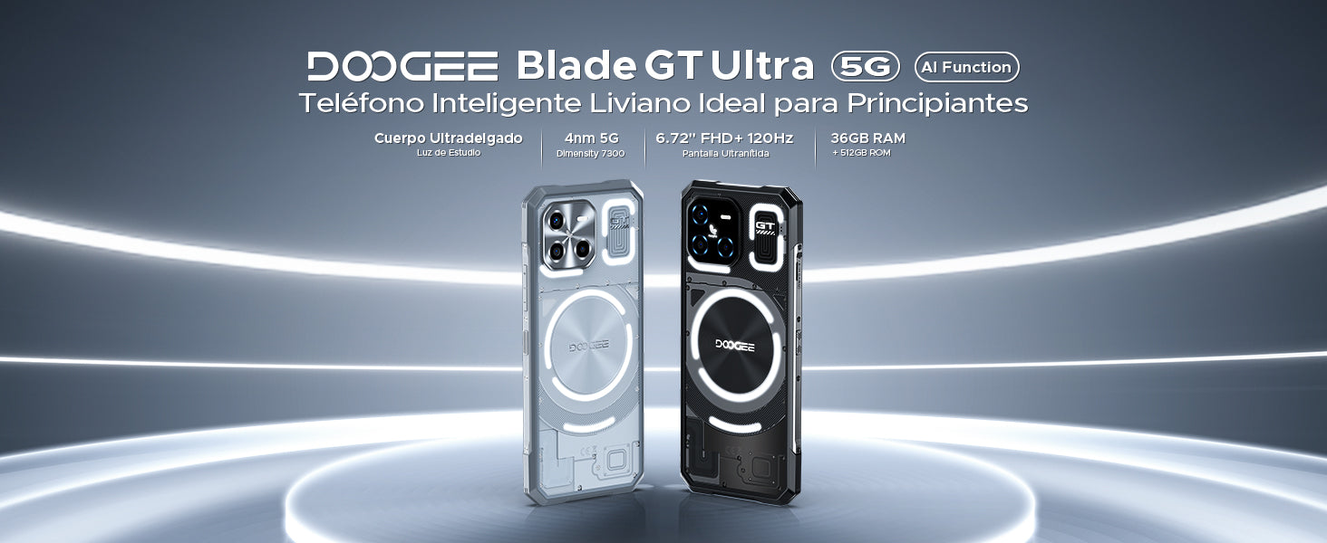 DOOGEE Blade GT Ultra Telรฉfono mรณvil robusto 5G Android 14 y cรกmara con IA y efecto de luz LED