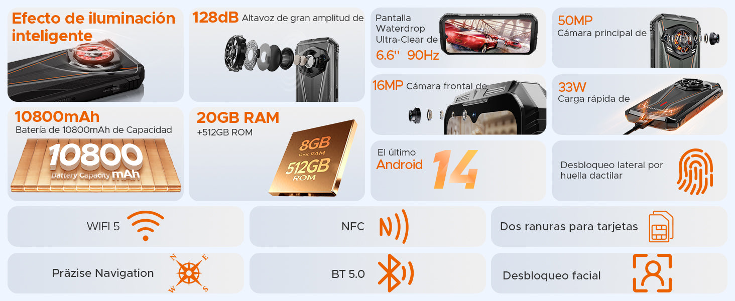 Más potencia: el procesador Dimensity 7050 5G ofrece un rendimiento superior y una potencia de vanguardia. teléfono móvil irrompible Blade GT tiene velocidades de reloj de 8 núcleos de hasta 2,6 GHz / 6 nm. Viene con Android 14, que ofrece una interfaz intuitiva, capacidades multitarea avanzadas y múltiples opciones de personalización para el entretenimiento y uso diario.