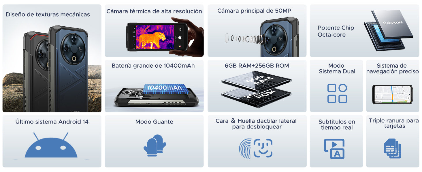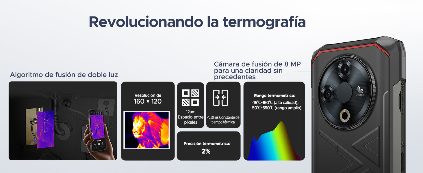 DOOGEE FIRE 6 Este teléfono móvil resistente está equipado con la mejor tecnología de imágenes térmicas, capaz de cubrir un rango de temperaturas de -15°C a 150°C. La función de imágenes térmicas de alta calidad y amplio rango abarca de 50°C a 550°C, la monitorización de seguridad en ambientes de alta temperatura. Este telefono resistente agrega un sistema de imagen térmica dual, ampliando las aplicaciones del dispositivo en la medición de temperatura, visión nocturna y sectores industriales.*Abra la aplicación «Cámara térmica» en el escritorio de su smartphone y comience a utilizar la cámara termográfica.