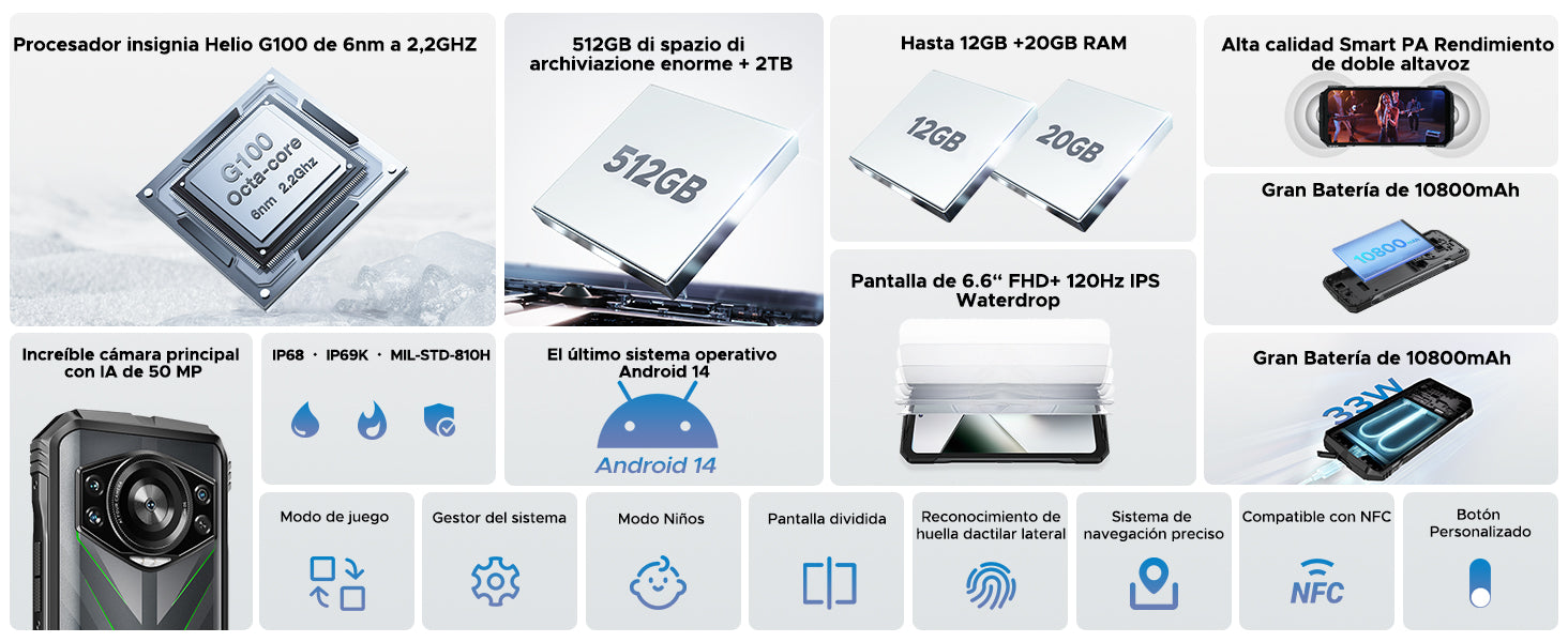DOOGEE S118 Teléfono resistente Android 14 12+512G con batería grande de 10800 mAh