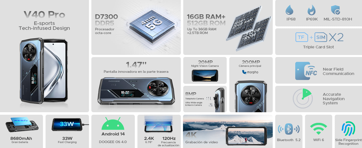El movil irrompible 5G DOOGEE V40 PRO es el primer movil todoterreno que cuenta con el procesador MediaTek de 4nm, que aprovecha el innovador proceso de fabricación de 4nm para lograr un rendimiento excepcional del chip, un menor consumo de energía y una mayor duración de la batería. Cuenta con una impresionante velocidad de transferencia de datos de hasta 44 GB/s, con una velocidad de lectura continua teórica de hasta 6400 MT/s. El chip de pantalla dedicado para juegos aumenta la velocidad de cuadros a 120 FPS, lo que garantiza un rendimiento fluido y sin interrupciones incluso en escenarios de juegos intensos o multitarea.